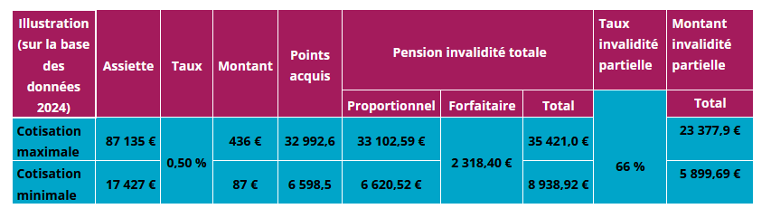 - En cas d’ invalidité dite partielle dont votre état de santé entraîne une baisse de votre capacité de travail de plus de 2/3, la CIPAV versera une pension d’invalidité partielle proportionnelle dont le minimum sera de 491,4€ mensuel et le maximum de 1 948,15€ mensuel.